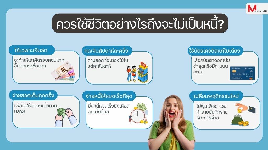- วางแผนการใช้เงินและทำตามอย่างเคร่งครัด เพื่อไม่กลับมาเป็นหนี้อีกครั้งและมีอนาคตทางการเงินที่สดใส เพราะการไม่มีหนี้คือการมีอิสระอีกอย่างหนึ่ง
