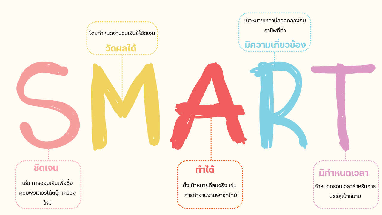 เพื่อสร้างเป้าหมายทางการเงินที่มีประสิทธิผล ให้ใช้หลักการ SMART: