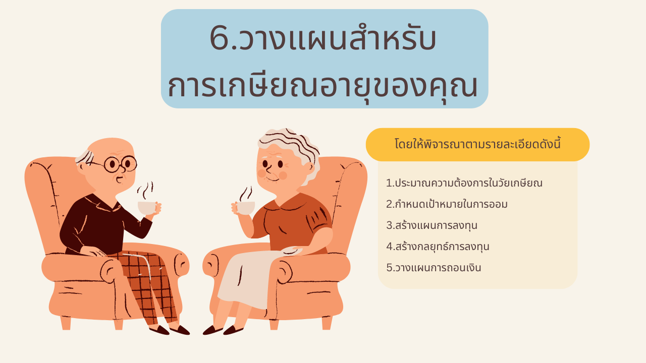 - กำหนดเป้าหมายในการออม : พิจารณาจำนวนปีจนถึงเกษียณเพื่อกำหนดอัตราการออมต่อปีที่เหมาะสม